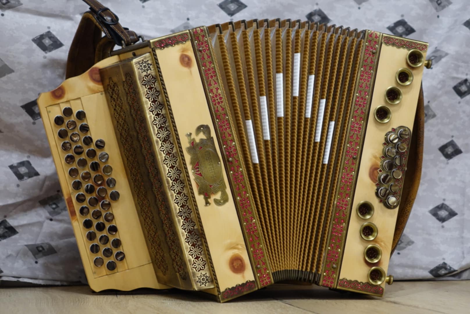 Elegantna bela harmonika z okrasnim vzorcem